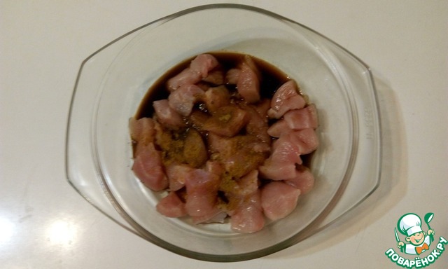 Куриное филе режем не большими кубиками 1,5-2 см. Маринуем в соевом соусе и карри. Ставим в холодильник на 2 часа. Время приготовления указано без маринования.