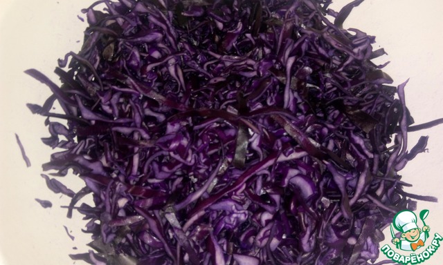 Краснокочанную капусту шинкуем, добавляем щепотку соли и мнем руками. Не забудьте одеть одноразовые перчатки, иначе покрасите руки.