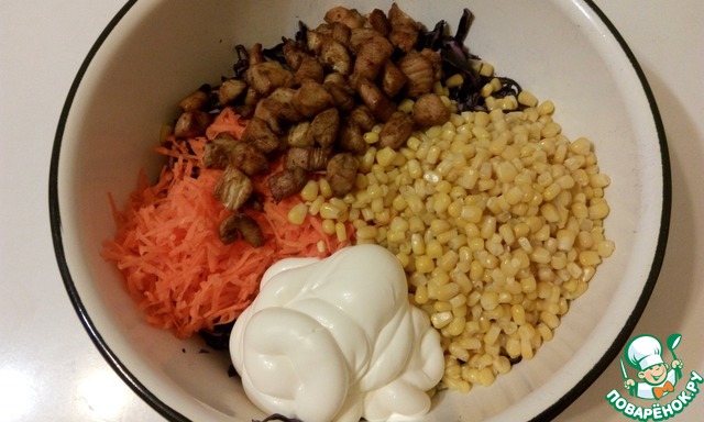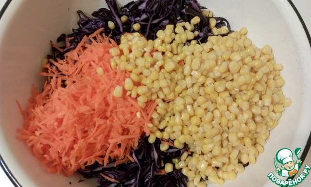 С кукурузы сливаем жидкость и добавляем к капусте с морковью.