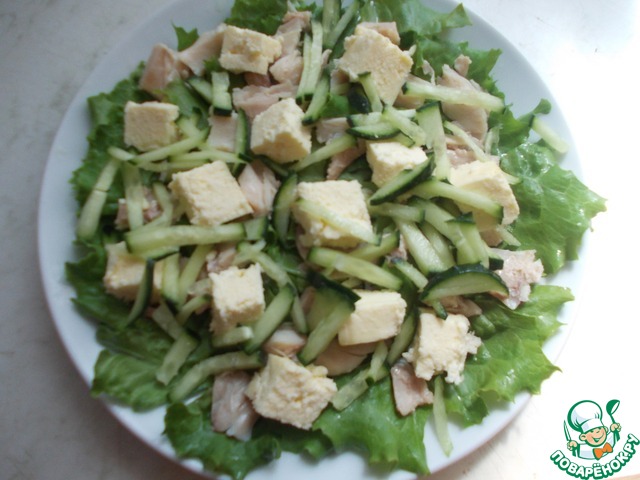 Чистые листья салата рвем руками и раскладываем на тарелки, сверху кусочки курочки и кубики сыра.