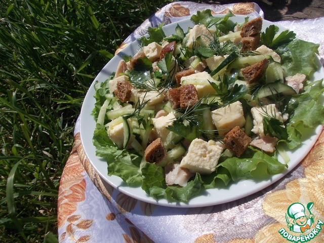 | Очень простой и вкусный салатик. Сухарики готовим самы, делая салат еще и полезным, а сыр конечно можете добавить на ваше усмотрение, но у меня был козий, домашний. |