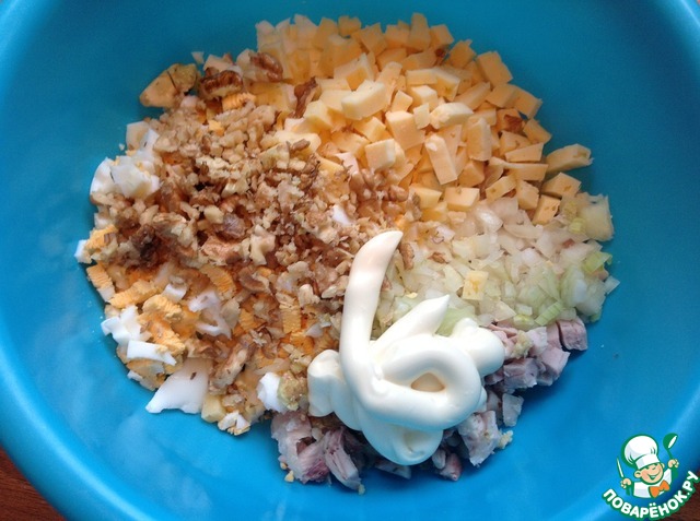 Сыр 70 гр нарезать маленьким кубиком, добавить майонез и орехи измельченные, но не совсем в крошку. Салат перемешать.