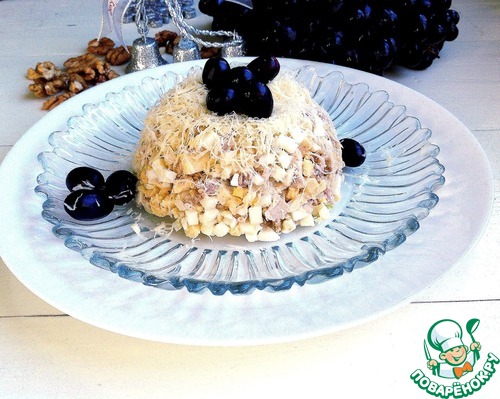 Сверху на салат натереть оставшийся сыр на мелкой терке и выложить виноград.