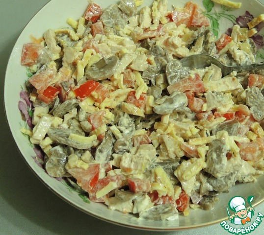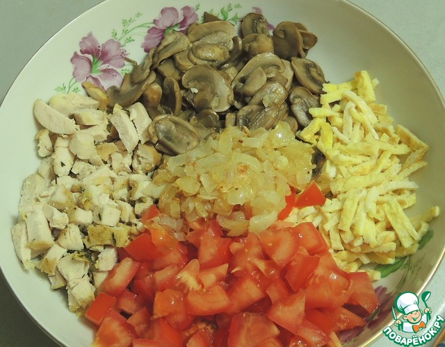 Все ингредиенты - курицу, помидоры, яйца, шампиньоны, лук - складываем в салатник. Приступаем к приготовлению соуса.