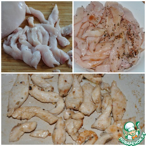 Нарежьте тонкими полосками куриное филе. Замаринуйте мясо в соевом соусе с добовлением молотого черного перца. Влейте в сковороду, где обжаривался редис, немного растительного масла и отправьте туда курицу.