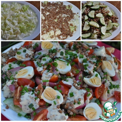 Нарежьте крупными кусочками пекинскую капусту. Капуста будет играть роль подушки для остальных ингредиентов. Затем горячую отварную гречку. Далее огурец, помидоры. Сверху жареный редис, тёплую курочку. Отварные яйца порежте на полавинкии добавьте в тарелку с салатом. немного зелени и срочно за стол!