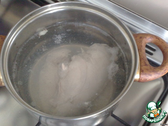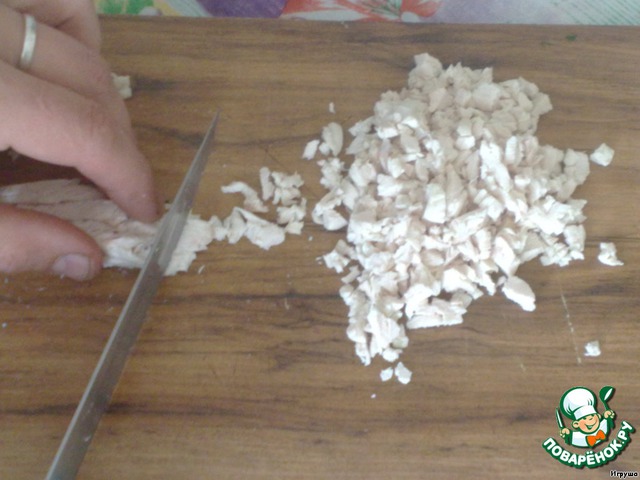 В серединку горкой выкладываем массу с курицей. А на серединку кладем капельку кетчупа.
