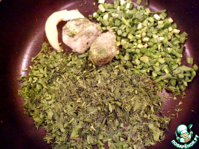 Всю зелень мелко порезать. На сковороду выложить топленое масло, зелень и шпинат. Пассируем, помешивая минуты 3, остудить.