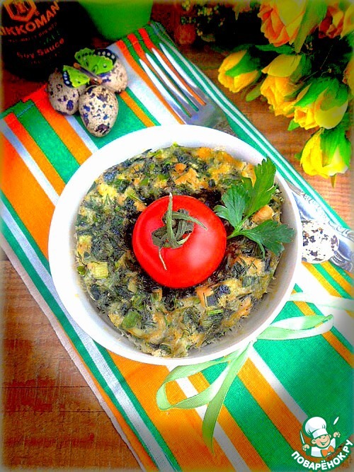 Взбить перепелиные яйца, добавить к ним пассированную зелень, курицу и натертый сыр. Получается довольно густая масса.