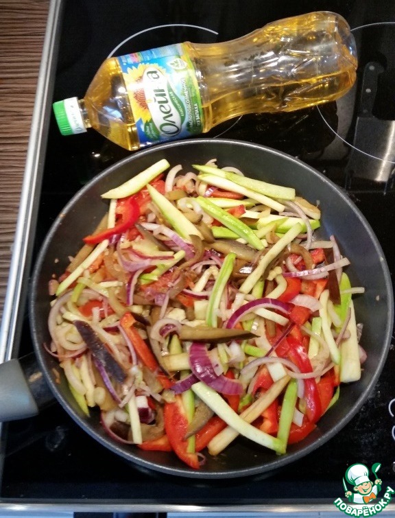 На разогретую сковородку с растительным маслом, положить порезанные овощи, посолить, поперчить, добавить орегано, пассировать 10 минут. Убрать с плиты.