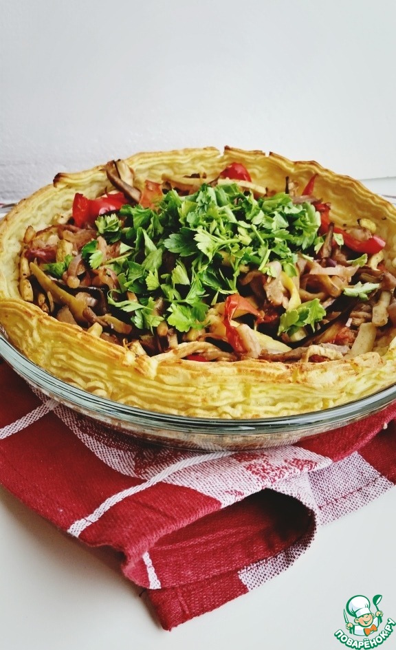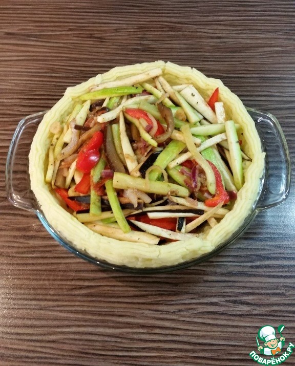 Спассированные овощи выложить в центр картофельного кольца. Разогреть духовку до 200 градусов, поставить форму, запекать 20 минут.