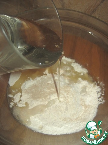 Сахар, соль, растопленный постный маргарин, часть муки и дрожжи залить горячей водой