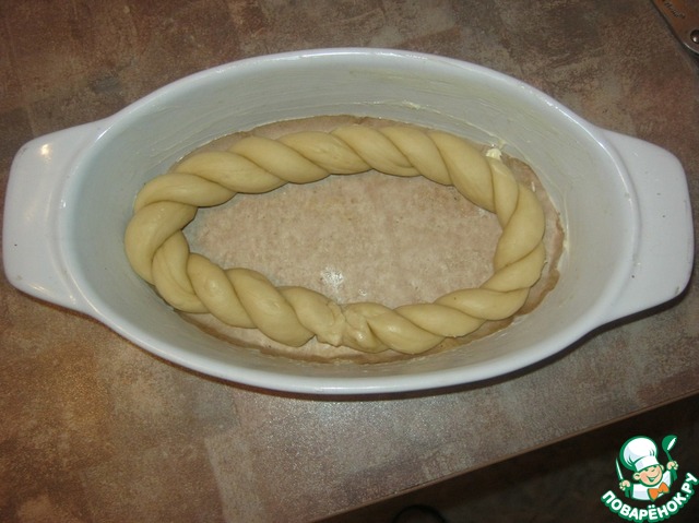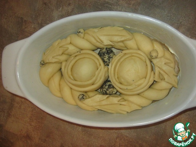 Выкладываем листики на косу из теста. я ещё в свободное пространство положила шарики с маком