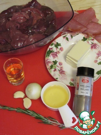 Вот наши ингредиенты. Время указано без учета варки паштета. Печень очистить от пленок и протоков. С веточки розмарина снять только листики, стебель нам не нужен.