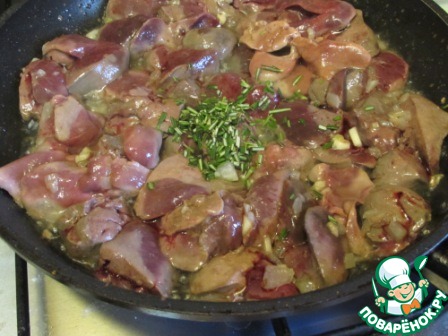 Лук мелко порезать, печень посолить, поперчить и обжарить на растительном масле 10-12 мин. на среднем огне. Добавить измельченные листики розмарина и продержать на огне минутки 3.