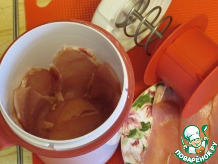 На дно и стенки ветчинницы выложила балык в нахлест без зазоров. На фото видно, что я использовала адаптер, насадку для приготовления половины порции.