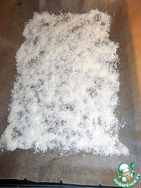 Форму для запекания смазываем маслом (противень лучше застелить бумагой для выпечки; керамическую форму достаточно просто смазать маслом) и засыпаем дно тонким, но сплошным слоем тертого пармезана.