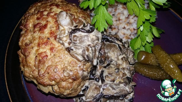Поливаем их грибным соусом и подаем с гречневой кашей.