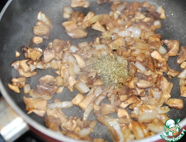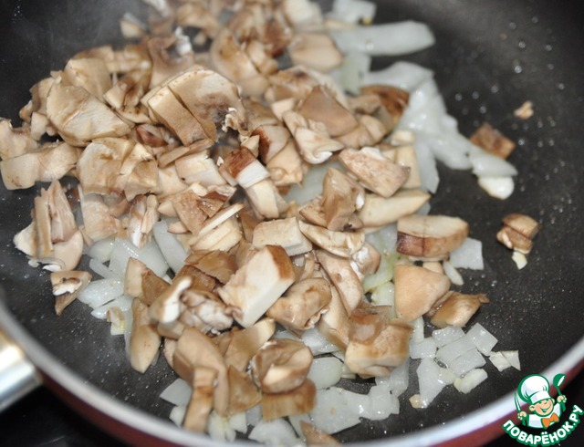 Добавляем мелкопорезанные шампиньоны или любые другие грибы. Обжариваем пару минут, помешивая.