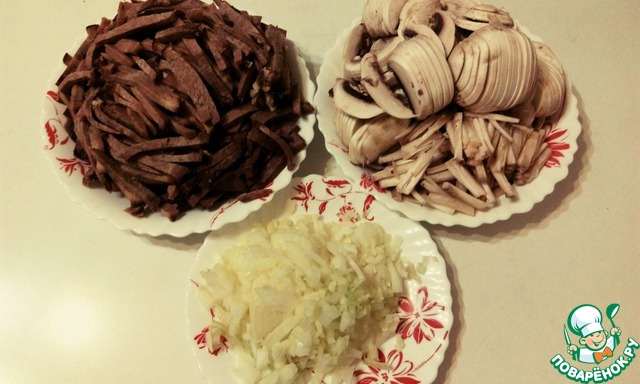 Отварной язык и шампиньоны нарезать соломкой. Лук кубиком.