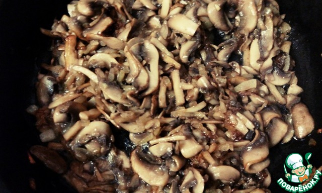 На подсолнечном масле обжарить лук с грибами до румяности.