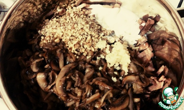 В кастрюлю с толстым дном сложить : язык, грибы, орехи, чеснок продавленный через пресс, сметану. Можно немного добавить воды, если сметана сильно густая. Все перемешать и на медленный огонь тушиться, часто помешивая.