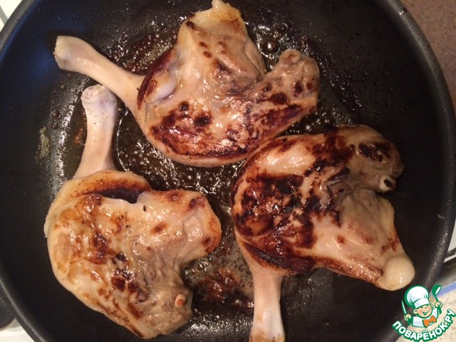 ... с двух сторон. Степень "припалистости" на фото. Т. е. просто прижечь корочку, не более того. Это необходимо, чтобы запечатать внутри ножки все соки и не высушить ее в процессе приготовления.