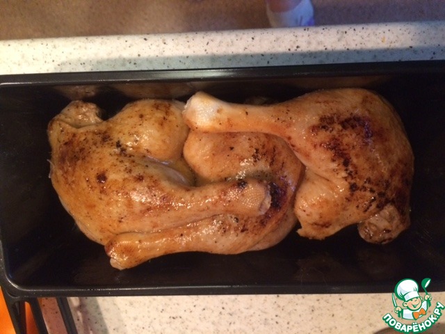 Сложить окорочка в подходящую форму. В моем случае 3 ножки запросто поместились в форму для выпечки кекса. Влить немного маринада (около 30-40 мл, по вкусу). Туда же влить растопленное сливочное масло со сковороды. Это будет чудесная основа для соуса.