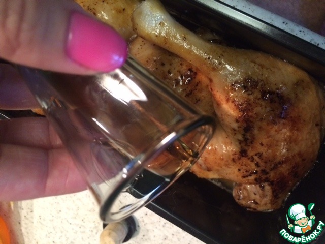 Смазать сверху ножки медом - для красивой корочки и пикантного привкуса. Вообще мой муж не любит сладости в мясных блюдах, но в "корочках" даже не ощущает, все только головой качает, как красиво получается, а я и не сознаюсь, что это просто мед красит))) Поставить в духовку на 40 минут на среднюю температуру.
