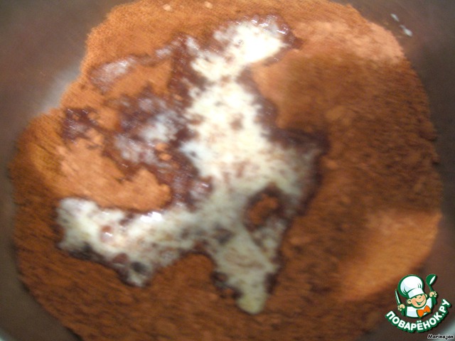 Шоколадно-миндальное печенье измельчить в процессоре, добавить расплавленное масло и ванилин (я дополнительно добавила какао), хорошенько перемешать.
