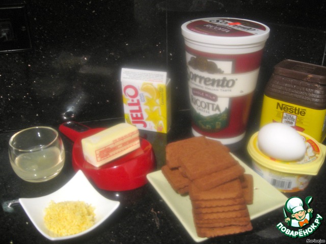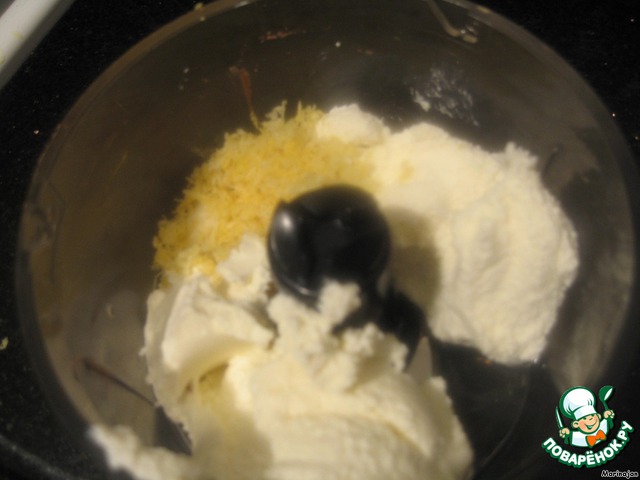 Начинка: Рикотту, сыр Филадельфия, белый шоколад (можно заменить сахарным песком), сок и цедру 1 лимона, яйцо и ванилин прокрутить в процессоре 2-3 мин.