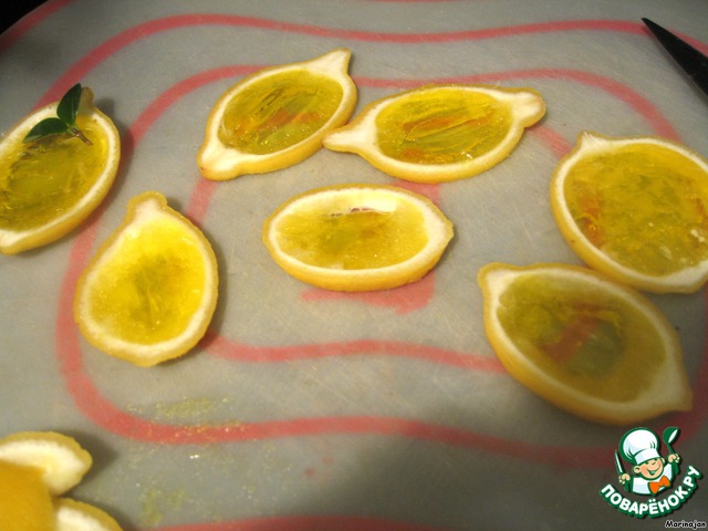 Замороженные лимоны тонко нарезать острым ножом на пластинки.