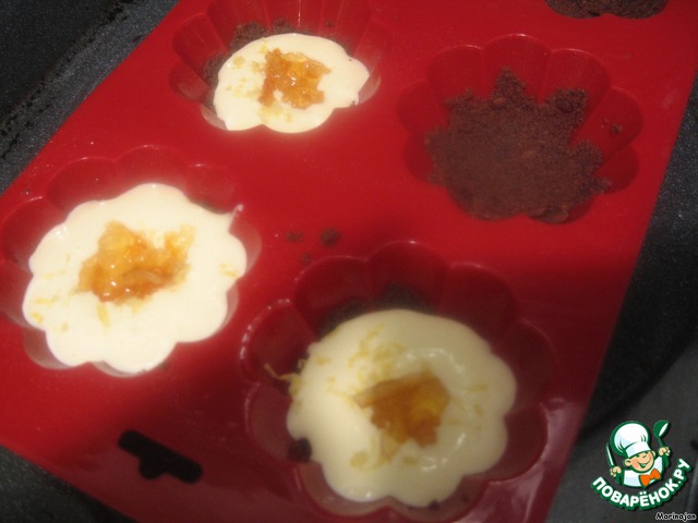 Начинку заливаем послойно : 1 ч. ложка начинки, лимонное желе с кусочками цедры и до верха снова начинку.