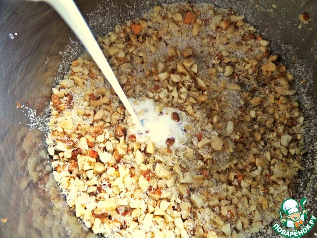 Лучше всего ипользовать грецкие орехи, но у меня они плохо чистились, надоело и решила половину заменить на арахис-уже очищенный и обжаренный.