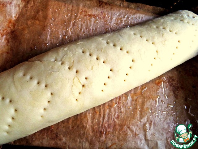 Раскатываем в пласт на доске с мукой. У моего были такие размеры: 26 см на 30 см.