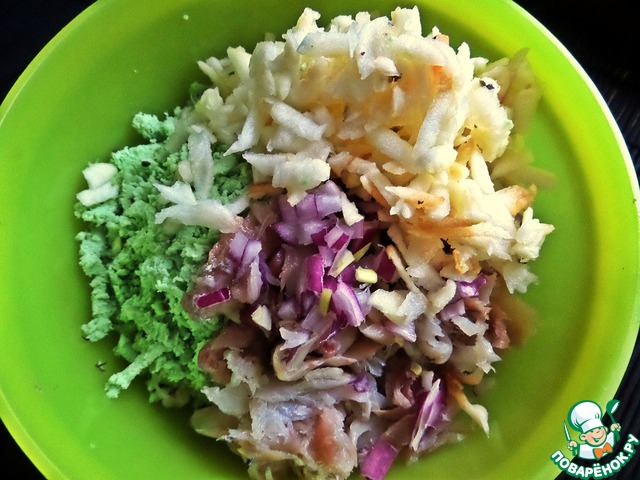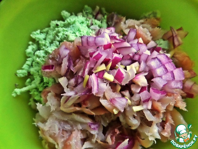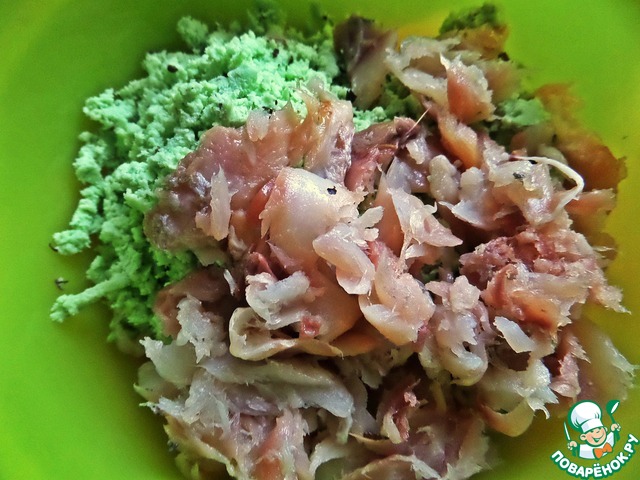Тушку скумбрии распотрошить на кусочки, убрать все косточки.