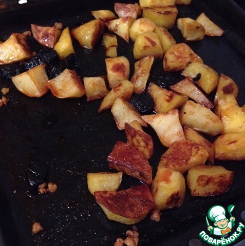 Через 50-65 минут кидаем к картофелю промытый и обсушенный чернослив, посыпаем все это дело солью и ставим в духовку на 5-7 минут.