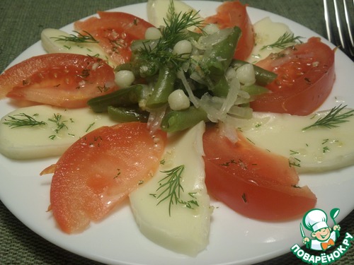 На тарелку выкладываем сыр и помидор, поверх которых фасоль с луком. Сверху поливаем приготовленной заправкой. Добавляем зелень. Накрываем тарелки пищевой пленкой и ставим в холодильник на 15 минут. Затем вынимаем их холодильника, снимаем пищевую пленку и подаем салат на стол.