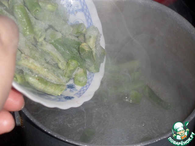 Зеленую стручковую фасоль отвариваем в слегка подсоленной воде. Откидываем на дуршлаг и обдаем холодной водой.