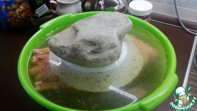 Кладем гуся в емкость с рассолом и придавливаем прессом, чтобы он полностью находился в жидкости (у меня в роли пресса выступает специально привезенный с Черного моря камень). И отправляем тазик на ночь в холодильник.