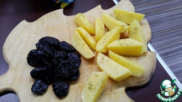 Режем картошку дольками, но не сильно мелкими, солим, перчим, я ещё чуть посыпала сушеным укропом и смешиваем с черносливом.