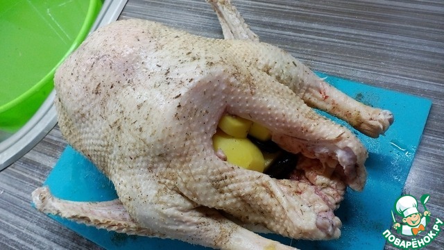 Начиняем гуся картошкой с черносливом, но не плотно - важно, чтобы оставалось место для воздуха. Перчим, НО НЕ СОЛИМ (гусь уже впитал в себя соль из рассола). Можно посыпать приправами, какие вам нравятся. Далее заворачиваем гуся в фольгу, отправляем в разогретую до 180 градусов духовку и выпекаем при такой температуре в течение 3х часов. Если гусь большой, то время нужно увеличить. Проверяем на готовность вилкой - если мягкий, то снимаем фольгу и оставляем ещё минут на 10-15 для того, чтобы гусь приобрел красивый золотистый оттенок, и достаём.