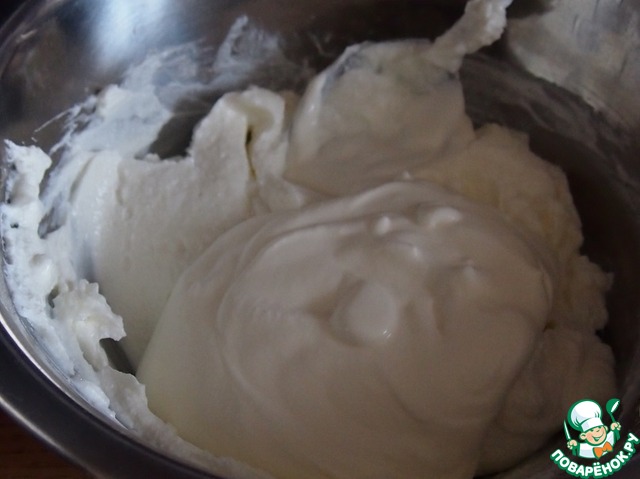 Сливки взбить до тугих пиков. Мягкий творог перемешать с сахарной пудрой, добавить взбитые сливки, осторожно перемешать.