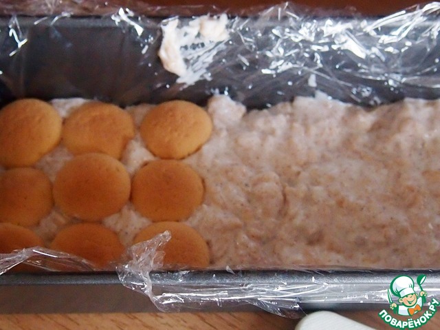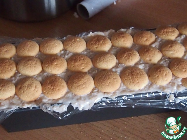 Форму застелить пищевой пленкой, чтобы края свясали через верх. Выложить печенье. У меня аналог савоярди, только в виде маленьких круглых бисквитных печенек. Такого печенья понадобилось примерно 230 г.