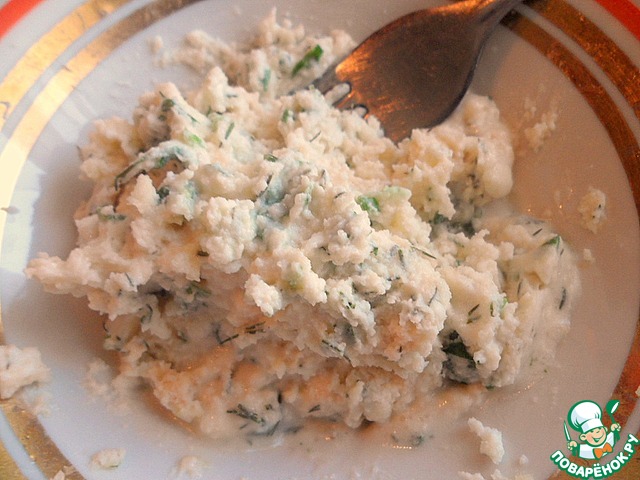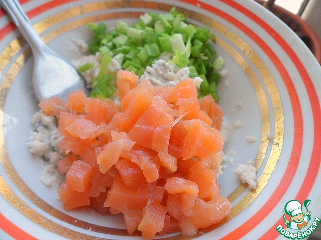 Добавить туда мелко нарезанные лук и форель. Посолить по вкусу.