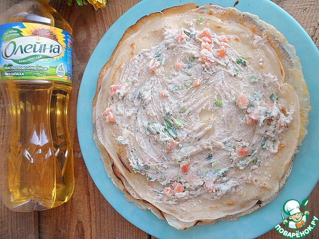 | Блины с соленой творожной начинкой, с добавлением зелени, лука и красной рыбы- одна из самых любимых начинок в нашей семье. |