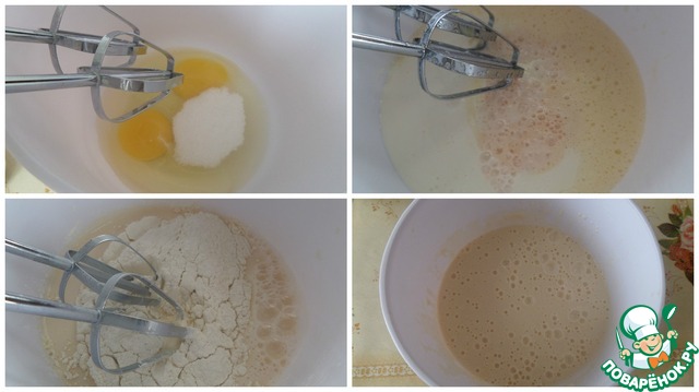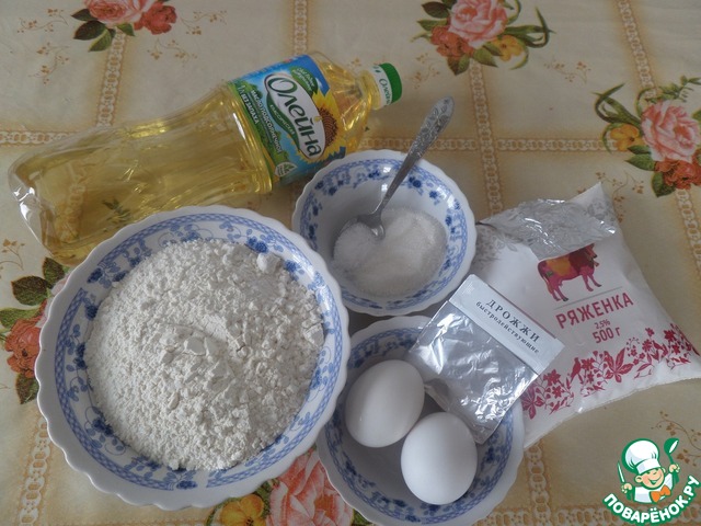 Яйца взбиваем с сахаром и солью. Добавляем ряженку (комнатной температуры) и дрожжи. Просеиваем муку. Замешиваем тесто. Оставляем на 1 час при комнатной температуре.