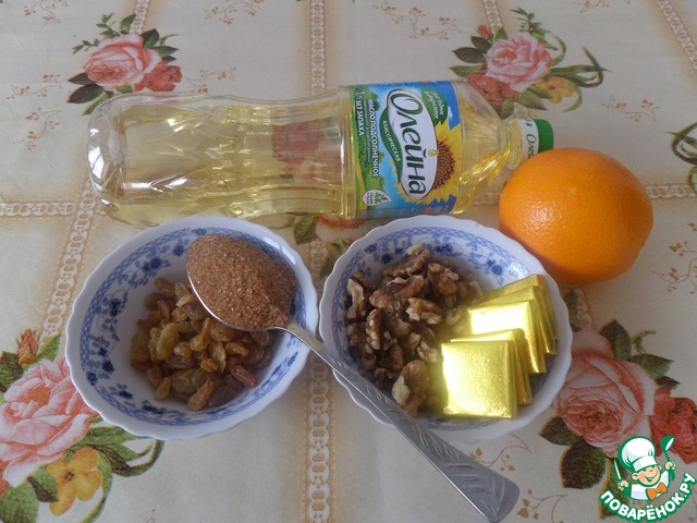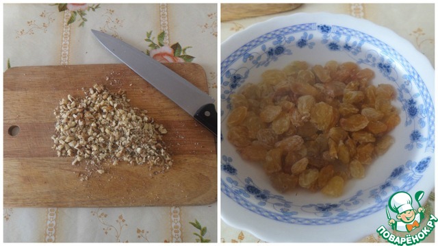 Изюм промываем и заливаем горячей водой. Рубим ножом орехи.