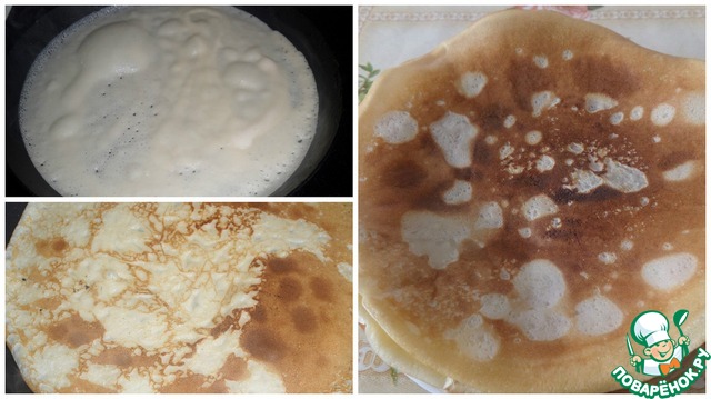 На раскаленной сковороде (предварительно смазанной) выпекаем блины. У меня получилось 18 шт., диаметр сковороды - 18 см.