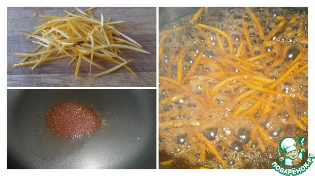 С апельсина ножом снимаем цедру и нарезаем соломкой. В сковороду наливаем 1ст. л. растительного масла и добавляем 1 ст. л. сахара ( коричневый ). Затем добавляем цедру и выжимаем сок из апельсина. Готовим 1 минуту после того, как масса закипела.